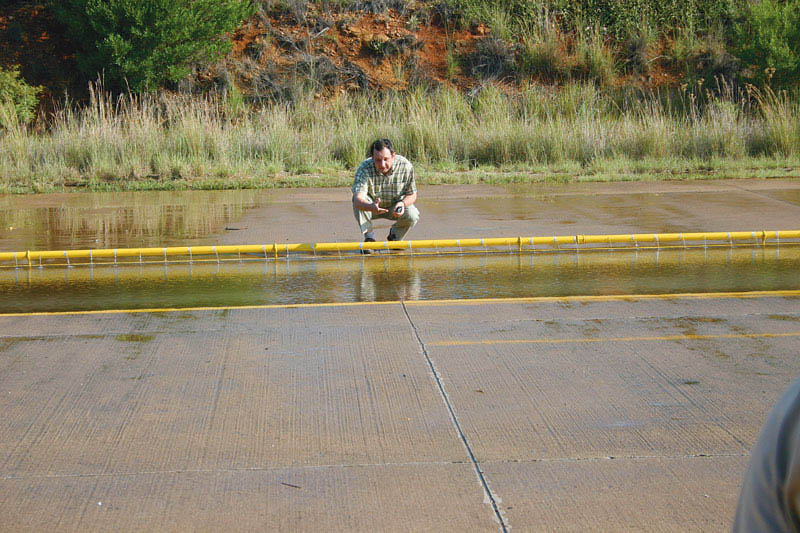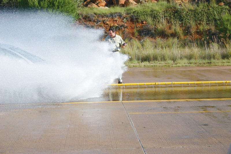 Теперь — тесты на аквапланирование в повороте. akvaplanКороткий сектор замкнутой асфальтовой трассы (круг диаметром 200 м) представляет собой «ванну» с водой глубиной около 10 мм. Водитель наматывает круги, каждый раз увеличивая скорость на 1 км/ч, и фиксирует момент, когда автомобиль начинает уплывать с заданной поворотом руля траектории. После этого он продолжает увеличивать скорость — до тех пор, пока автомобиль не выскользнет за пределы размеченного коридора. Это и есть предельная скорость выполнения маневра.