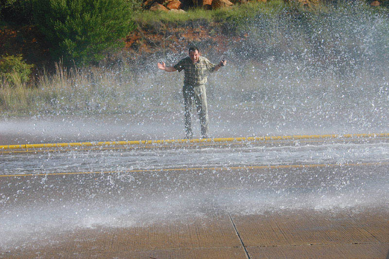 Улучив минуту затишья в тестах, Подорожанский решил рассказать перед камерой о том, как испытываются шины на стойкость к аквапланированию. Установили камеру, начали репетировать. Подорожанский приседает рядом с ванной, окунает в нее палец — и говорит, что глубина воды здесь около двух сантиметров. Тем часом находящийся вне творческого процесса Олег Растегаев выехал из бокса, где на Audi был установлен очередной комплект подопытных шин, и, набрав нужную скорость, направил автомобиль в ванну с водой. Когда он заметил на обочине лицедействующего шефа, тормозить уже было поздно…